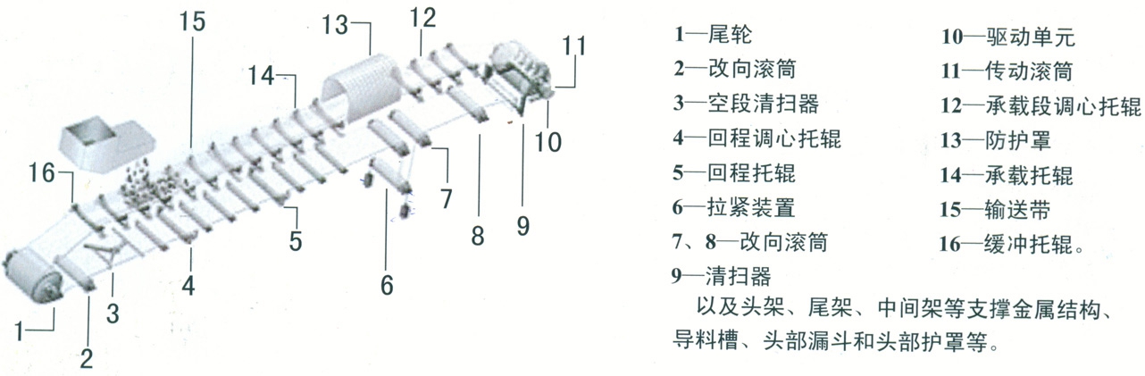 帶式輸送(sòng)機的基(jī)本機(jī)構 自運牌帶式輸送機的主要組成單元采(cǎi)用標準(zhǔn)化設計製 帶式輸送機保護(hù)裝置、電氣控製、計量裝置、金屬探測及清除器、斷帶(dài)捕(bǔ)捉器、輸送帶清(qīng)洗裝置、除水裝置